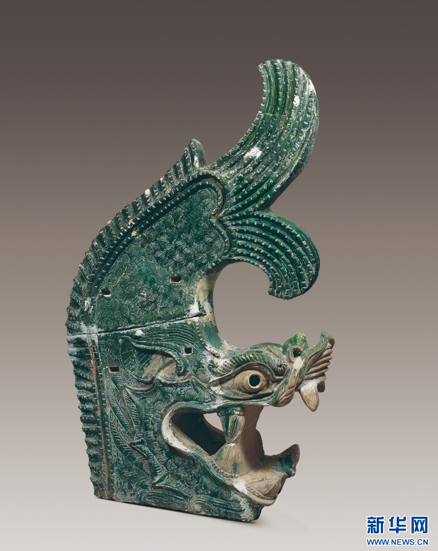 在中国国家博物馆“古代中国”基本陈列上,一件出土于西夏陵6号陵的绿釉鸱吻十分显眼。作为西夏陵的一个建筑构件,它形体高大,既与同时期中原地区的鸱吻相似,又具有龙头比例更大、鱼尾分叉等方面的独创性。