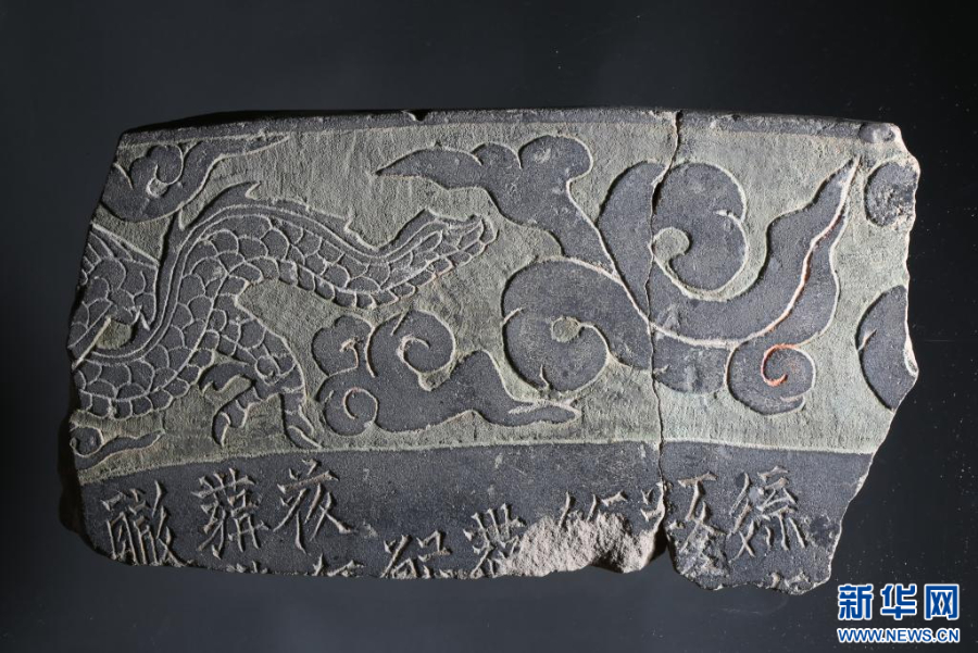 西夏文彩绘描金云龙纹灰砂岩残碑。(银川西夏陵区管理处供图)