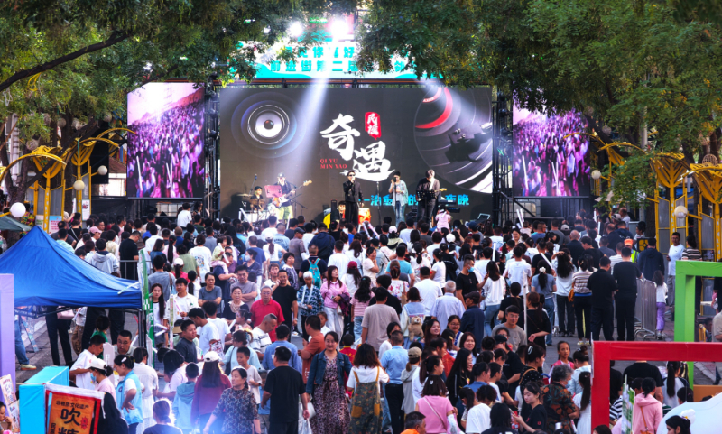 此次活动还为评选出的敬德商圈“五星商户”,社区“好居民”“好组织”及“好小哥”等进行表扬。傍晚时分,暮色渐浓,现场灯光骤然亮起,“中华民族一家亲 同心共筑中国梦暨‘奇遇民谣演唱会’”正式启幕。舞台上民族乐器与现代吉他交织,歌手弹唱着融合多民族元素的民谣,台下观众挥舞荧光棒,跟着旋律轻声合唱,欢呼声与音乐声此起彼伏,温暖的氛围瞬间点燃全场热情。